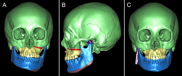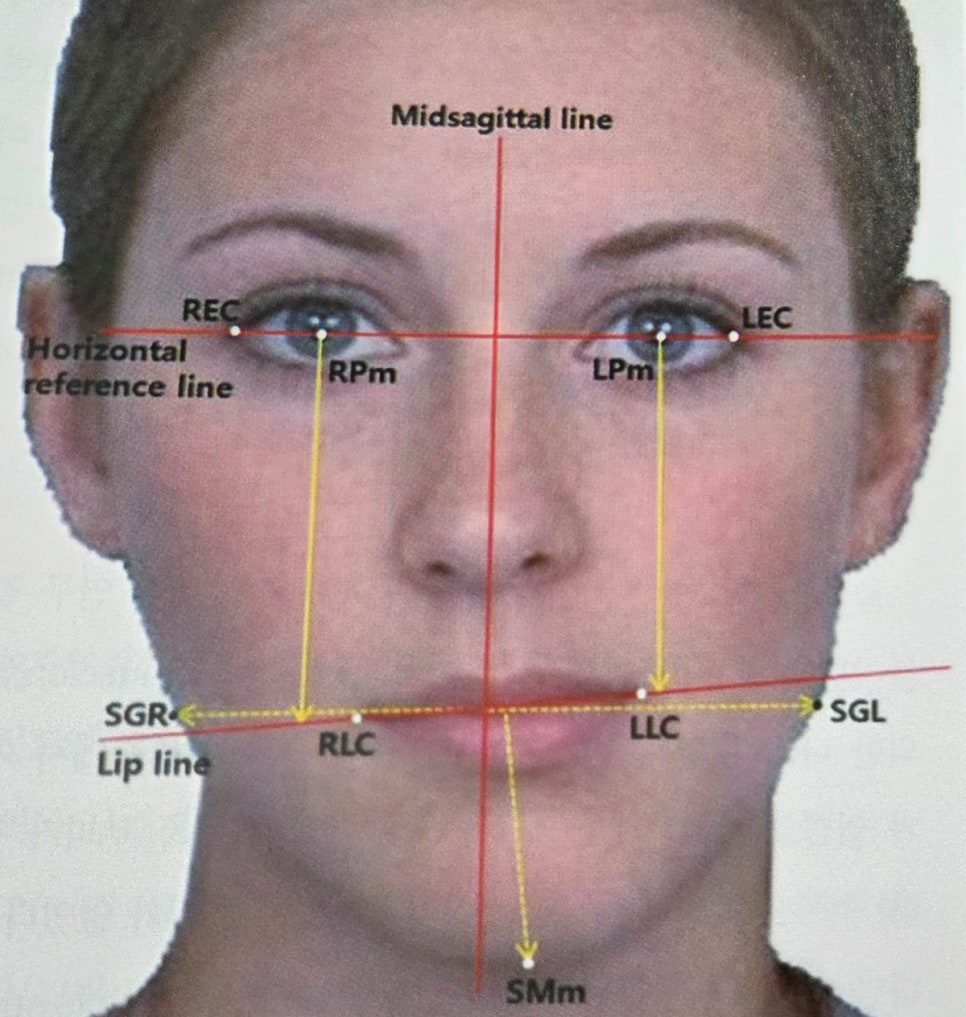 전통적으로 얼굴사진, 정면두부방사선사진 및 파노라마, 이하두정방사선사진 등의 2차원 영상을 이용해 왔으며 위 사진과 같이 얼굴 사진에서 두 눈의 동공을 연결한 선을 기준으로 수직 이등분하면서 콧등을 지나는 선을 안면 중심선으로 설정하여, 이를 기준으로 상악과 하악골의 중심과 상하악 치열의 중심 등을 비교 분석하여 비대.칭의 여부와 정도를 평가합니다. 그러나 이러한 2차원 영상은 한계가 존재하기 때문에 정확한 평가와 진단, 치료계획을 위해서는 3차원 영상의 촬영을 해야 합니다. 촬영시에는 자연스러운 머리 자세를 취해야 하며 두개 안면 구조물 위에 설정한 계측점에 의해 기준 평면을 설정하여 수.술 시 안.면 비.대.칭을 개선하기 위한 계획을 수립하게 됩니다. 치아교정치료만으로 해결되기 어려운 심한 골격적 부조화가 있는 경우, 상하악골의 위치를 수술적으로 이동시키는 악교정수술이 필요합니다. 술 후 최종적인 악골의 위치를 결정하는 가장 중요한 두 가지 요인은 수.술 계획 시 결정하는 위턱의 위치와 수.술 교합입니다. 하악골의 위치는 상악골의 위치와 수.술 교합에 따라 자동으로 결정됩니다. 수술 시 위턱과 아래턱의 골절술을 시행하고 수.술 교합용 스플린트를 장착하면, 상하악골의 하나의 복합체가 되어 3차원 공간상에서 전후, 좌우, 상하 방향으로 자유롭게 움직일 수 있습니다. 교합평면의 캔팅(canting)이 존재하는 경우, 상악골 좌우의 차등적인 함입(impaction)이 필요한 경우가 자주 있습니다.